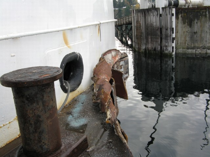Les avaries au navire étaient confinées au liston avant du côté bâbord à l’extrémité nº 1 (Photo 2). Les couples 90 à 96 ont été endommagés sur une longueur d’environ 7 m et à une profondeur maximale de 1 m. Cela a provoqué une brèche dans la coque au compartiment du gouvernail à l’extrémité nº 1. Le placage de la superstructure attenante à cet endroit a également été déformé.