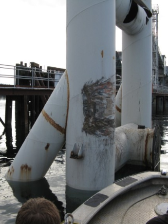 Les dommages au poste à quai nº 2 (annexe B) étaient restreints aux défenses du côté bâbord. Cela comprend les dommages à la défense du côté bâbord la plus éloignée et à son tampon articulé. À cause de cette collision, le tampon articulé s’est complètement détaché de la défense et a coulé au fond de la mer. Les points de fixation entre la défense et le tampon articulé ont été arrachés (Photo 4).