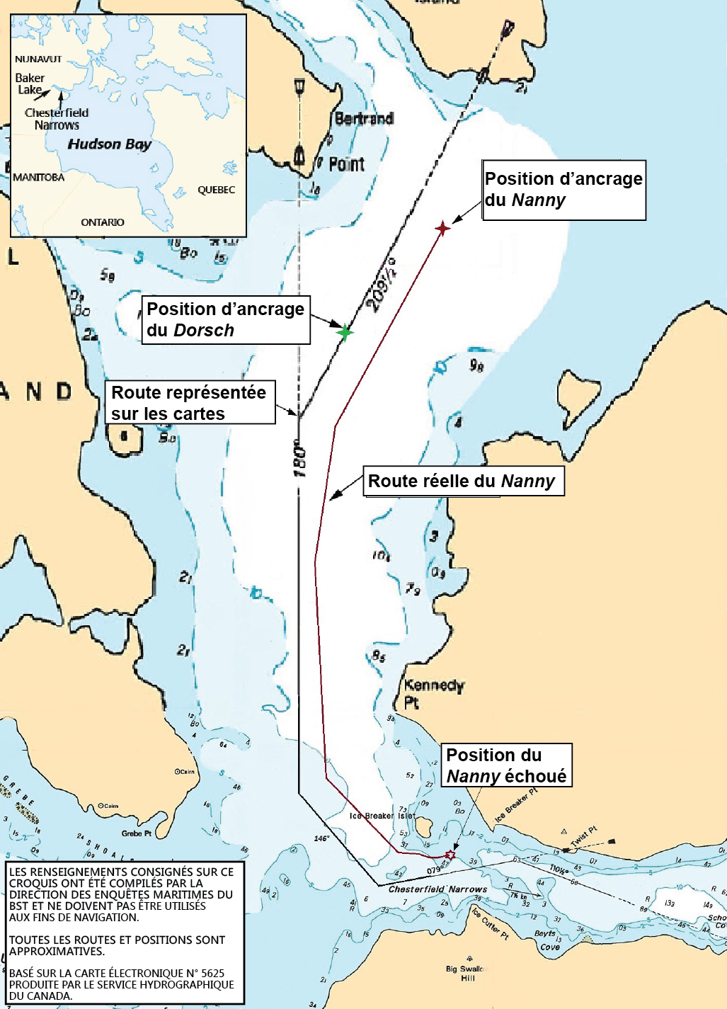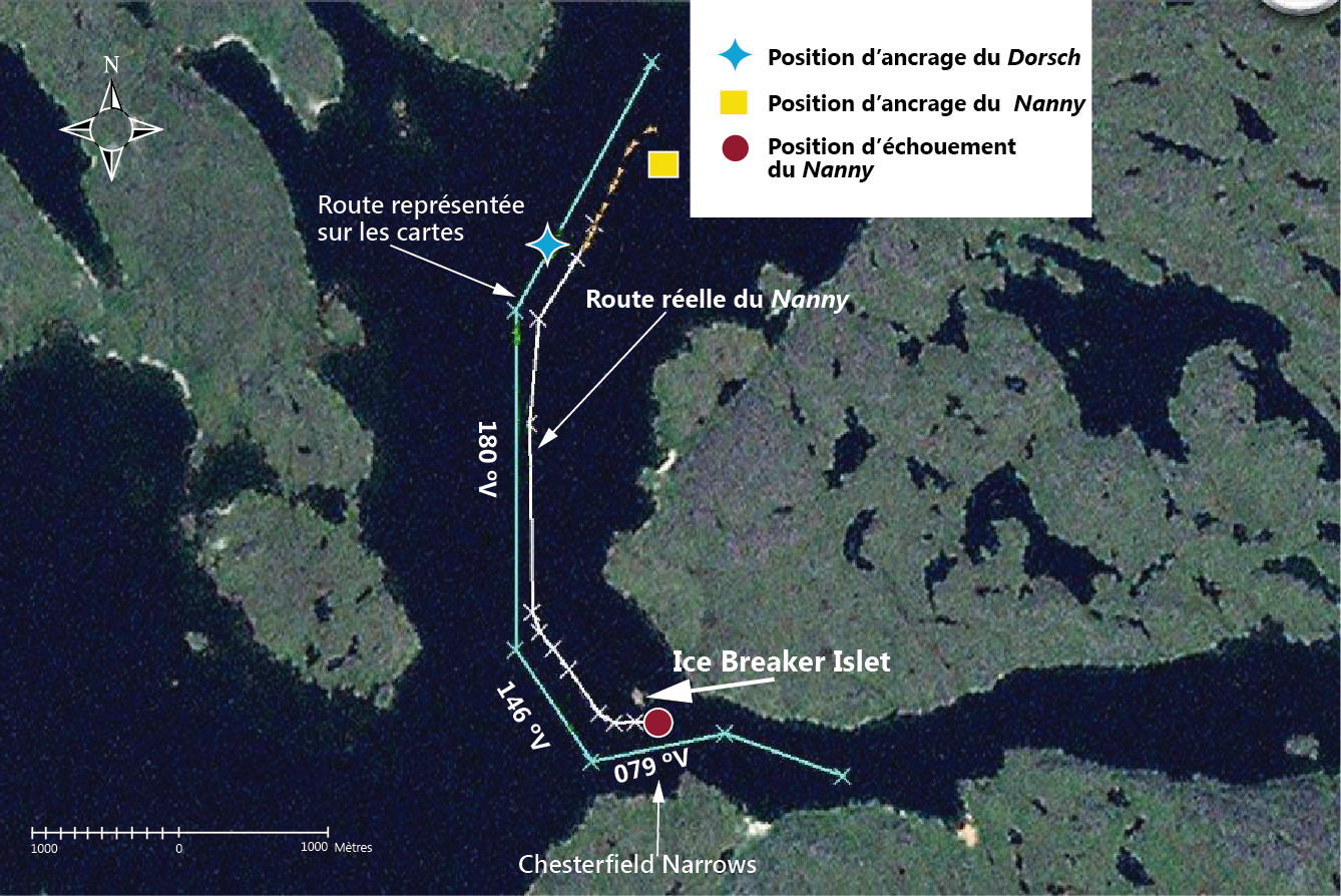 Le Nanny devait initialement s’écarter de la route représentée sur les cartes pour dépasser le Dorsch. Cependant, le capitaine et l’officier de quart n’ont pas discuté de cette manœuvre, et n’ont pas non plus échangé d’autres renseignements sur la navigation après que le navire eut levé l’ancre. Une fois qu’il eut dépassé le Dorsch, le Nanny a continué de progresser en suivant une route approximativement parallèle à la route représentée sur les cartes, et séparée d’elle par une distance allant jusqu’à 0,12 mille marin (nm). Cet écart par rapport à la route représentée sur les cartes s’est poursuivi même lorsque le navire a tourné à Chesterfield Narrows, secteur comportant des marques de navigation qui ne permettait qu’une faible marge d’erreur et exigeait du navire qu’il demeure le plus près possible de l’alignement prévu.