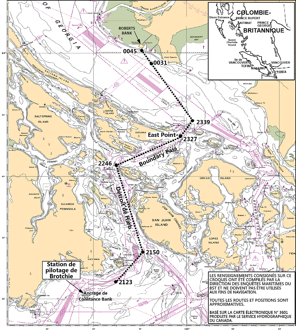 Le pilote est monté à bord du navire à 21 h 02 et a échangé des renseignements avec le capitaine au sujet de la manœuvre d’accostage prévue au poste à quai no 2 de Westshore Terminals. Pour cette manœuvre, des remorqueurs devaient rejoindre le navire à l’extérieur du bassin, l’amener à tribord pour l’éloigner du quai no 1, entrer dans le bassin et conduire le navire au quai no 2. Le capitaine et le pilote ont ensuite rempli et signé la fiche du pilote ainsi que la fiche de renseignements capitaine/pilote. Puis, le pilote a installé son unité portative de pilotage (UPP) pour surveiller la progression du navire. Le navire a poursuivi sa course, est passé devant East Point à 23 h 27 et a quitté Boundary Pass à 23 h 35. Pendant le passage, l’ancre côté bâbord a été préparée afin de pouvoir servir en cas d’urgence.