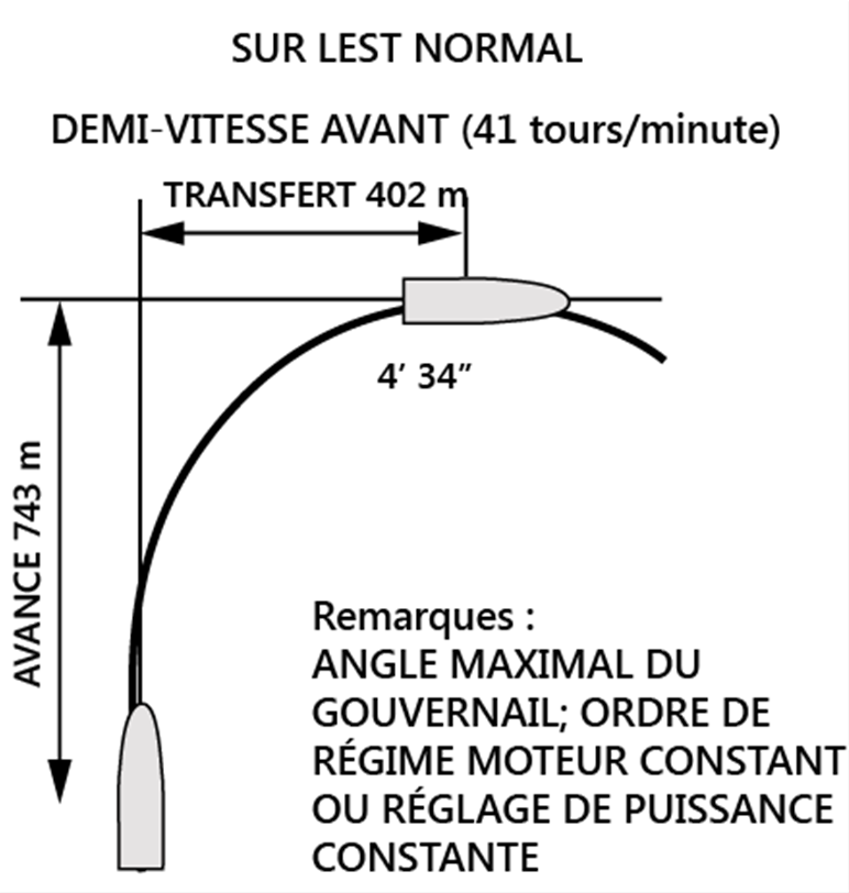 Selon les renseignements sur les manœuvres disponibles sur la passerelle, si le navire vire à tribord sur lest normal avec un angle de gouvernail maximal et avec les machines à demi-vitesse (41 tours/minute), l’avance est de 743 m (ou 4,0 encablures), le transfert est de 402 m et le changement de cap est de 90° (figure 2).