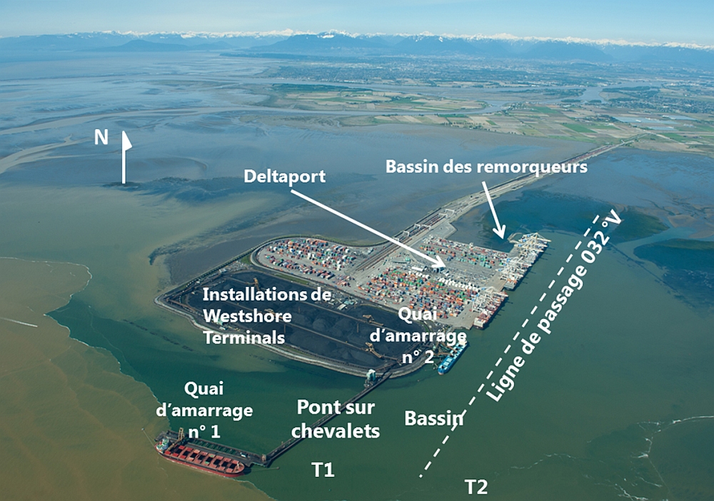 - Le parcours direct du Cape Apricot en direction de Roberts Bank exigeait un changement de cap plus prononcé vers tribord et plaçait le navire sur une ligne d’approche directe vers le pont sur chevalets.