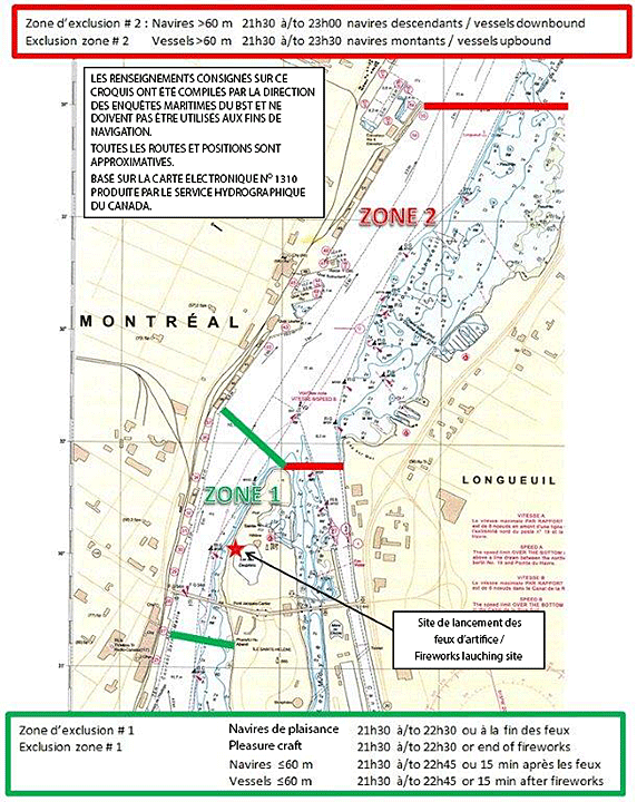 Chaque été, des spectacles de feux d'artifice sont organisés à La Ronde dans le Port de MontréalNote de bas de page 3. En 2013, aux dates prévues, les feux d'artifice avaient lieu entre 22 h et 22 h 30 à partir du dernier week-end de juin jusqu'au premier week-end du mois d'août. Le trafic d'embarcations de plaisance et la quantité de communications radio augmentent graduellement au cours des heures qui précèdent les spectacles de feux d'artifice.