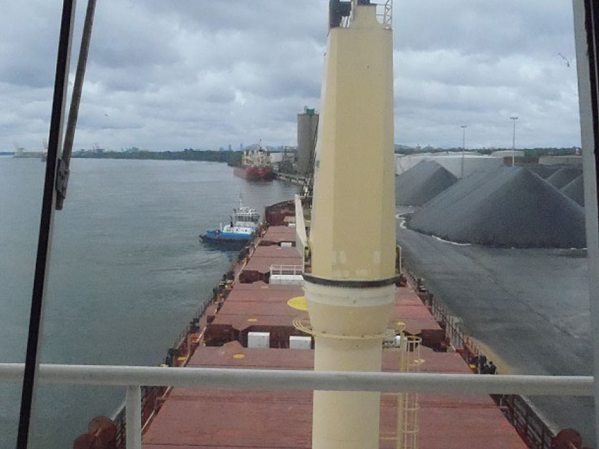Le Heloise est un transporteur de vracs solides construit en acier; la salle des machines et les quartiers d'équipage se trouvent à l'arrière du navire (photo 1). Ses 7 cales et écoutilles de chargement sont desservies par 3 grues électro-hydrauliques d'une capacité de 36 tonnes installées sur l'axe longitudinal du navire. La passerelle est pourvue d'une console de navigation qui est décalée par rapport à l'axe longitudinal du navire (annexe A). Selon l'endroit où l'on se trouve sur la passerelle, la vue par les fenêtres de la passerelle peut être obstruée par les grues (photo 2 et photo 3). La console de navigation comprend le poste de barre, un transmetteur d'ordres qui permet de commander la propulsion, et 2 radars (3 cm et 10 cm), soit 1 de chaque côté du poste de barre. Les 2 radars sont pourvus d'aides radar au pointage automatique (ARPA). La passerelle est aussi équipée d'un système d'identification automatique (SIA), de 2 radiotéléphones très haute fréquence (VHF), et d'un enregistreur des données du voyage (VDR)Note de bas de page 2. Au moment de l'événement, l'équipage comptait 22 membres, tous d'origine chinoise, et la langue de travail à bord était le mandarin.
