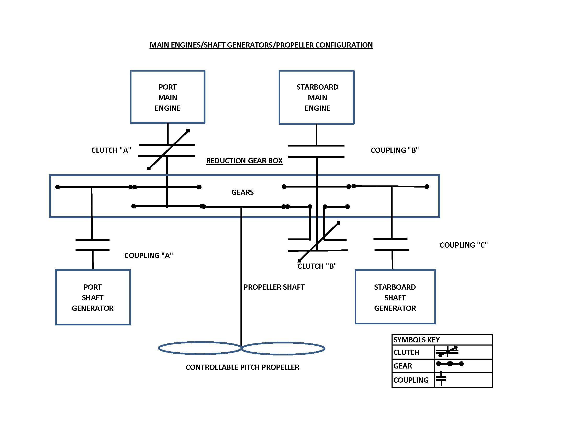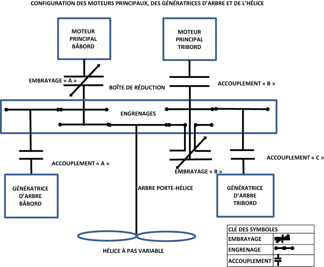 La propulsion est assurée par 2 moteurs principauxNote de bas de page 6 qui entraînent l’hélice à pas variable. L’arbre portehélice tourne dans le sens antihoraireNote de bas de page 7 et est raccordé aux moteurs au moyen d’une boîte d’engrenages qui réduit la vitesse de rotation des moteurs de 750 tr/min à 160 tr/min. Le navire est équipé de 2 génératricesNote de bas de page 8 d’arbre raccordées aux moteurs principaux au moyen de la même boîte de réduction. Le moteur principal bâbord est accouplé à l’arbre portehélice et à la génératrice d’arbre bâbord au moyen d’un embrayage; le moteur principal tribord est lui aussi accouplé à l’arbre portehélice au moyen d’un embrayage, mais il entraîne directement la génératrice d’arbre tribord (annexe A). Le navire est équipé d’un groupe électrogène de secours et d’un groupe électrogène diesel auxiliaire qui fournissent l’électricité. Il est aussi équipé d’un propulseur d’étrave électrique de 380 kW.