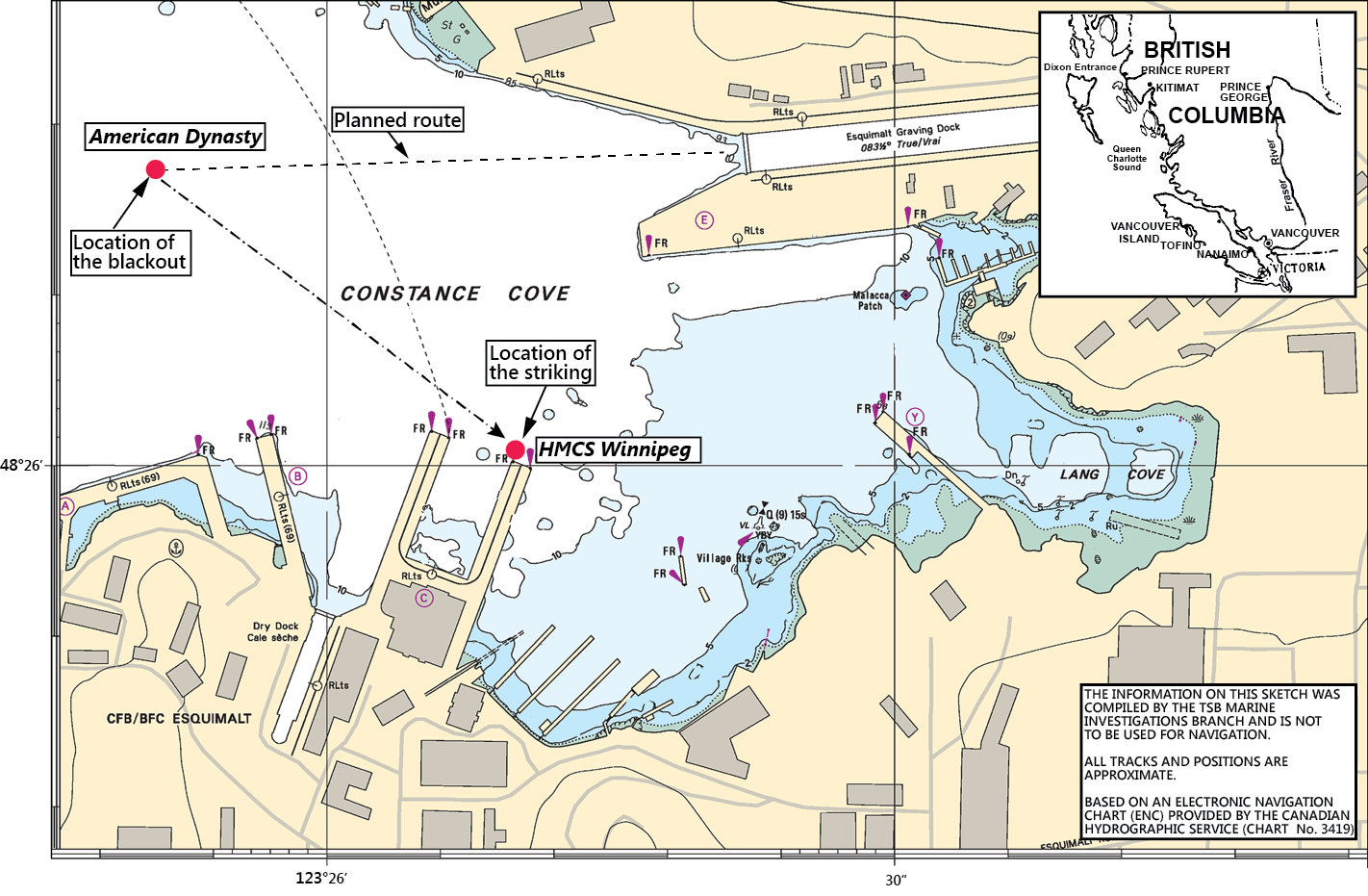 Vers 8 h 18 (heure avancée du Pacifique) le 23 avril 2013, le navire de pêche American Dynasty connaît une perte totale d'alimentation électrique (panne totale de courant) pendant qu'il s'approche de la cale sèche à Esquimalt (ColombieBritannique). Le navire est alors sous la conduite d'un pilote responsable des manœuvres d'amarrage, et aidé par 2 remorqueurs. À la suite de la panne totale de courant, l'American Dynasty accélère jusqu'à une vitesse estimée à 5 nœuds, vire à tribord et heurte le NCSM Winnipeg, qui est amarré à quai à proximité, à la Base des Forces canadiennes Esquimalt. Les 2 navires subissent d'importantes avaries et 6 travailleurs des chantiers navals à bord du NCSM Winnipeg sont légèrement blessés.