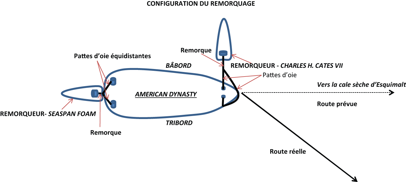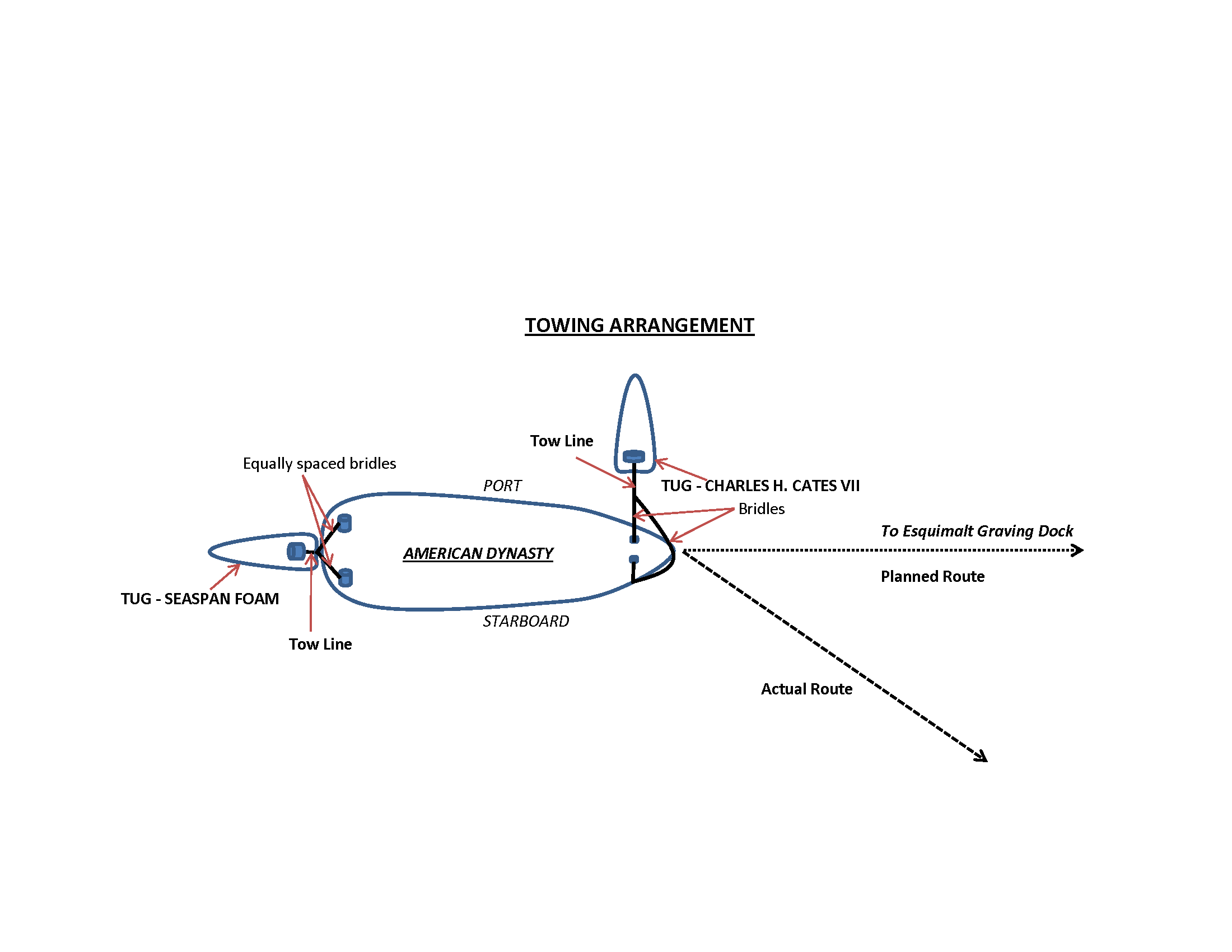 Ayant remarqué que le navire prenait de la vitesse et virait à tribord, le capitaine du Seaspan Foam a filé toute la remorque du bateau en tentant de ralentir et de réaligner l’American Dynasty en le tirant vers l’arrière. L’American Dynasty a toutefois continué à accélérer, et la garniture de frein du treuil du remorqueur s’est alors désintégrée. Pendant ce temps, le capitaine du Charles H. Cates XX a essayé 2 fois de réaligner l’American Dynasty en tirant sur la remorque depuis le côté bâbord, mais le remorqueur a chaque fois été engagé sur sa remorque. Le capitaine du Charles H. Cates XX a fait une dernière tentative, mais les pattes d’oie de la remorque se sont rompues et l’American Dynasty a continué à accélérer sur sa trajectoire en direction du NCSM Winnipeg.