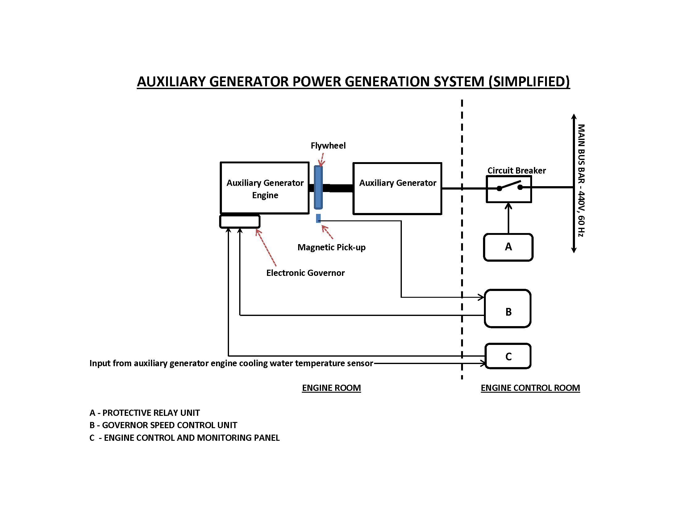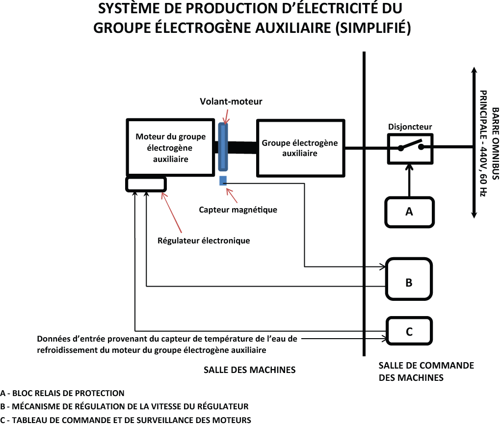 À bord de l’American Dynasty, l’énergie électrique principale peut être fournie par l’un ou l’autre générateur d’arbre, le groupe électrogène auxiliaireNote de bas de page 21 ou les 3 en même temps. Au moment de l’événement, c’est le groupe électrogène auxiliaire qui était utilisé. Ce groupe est entraîné par un moteur diesel équipé d’un bloc relais de protectionNote de bas de page 22 ainsi que d’un panneau de commande et de surveillance qui peut servir à vérifier les paramètres du moteur, par exemple la température de l’eau de refroidissement (annexe D).