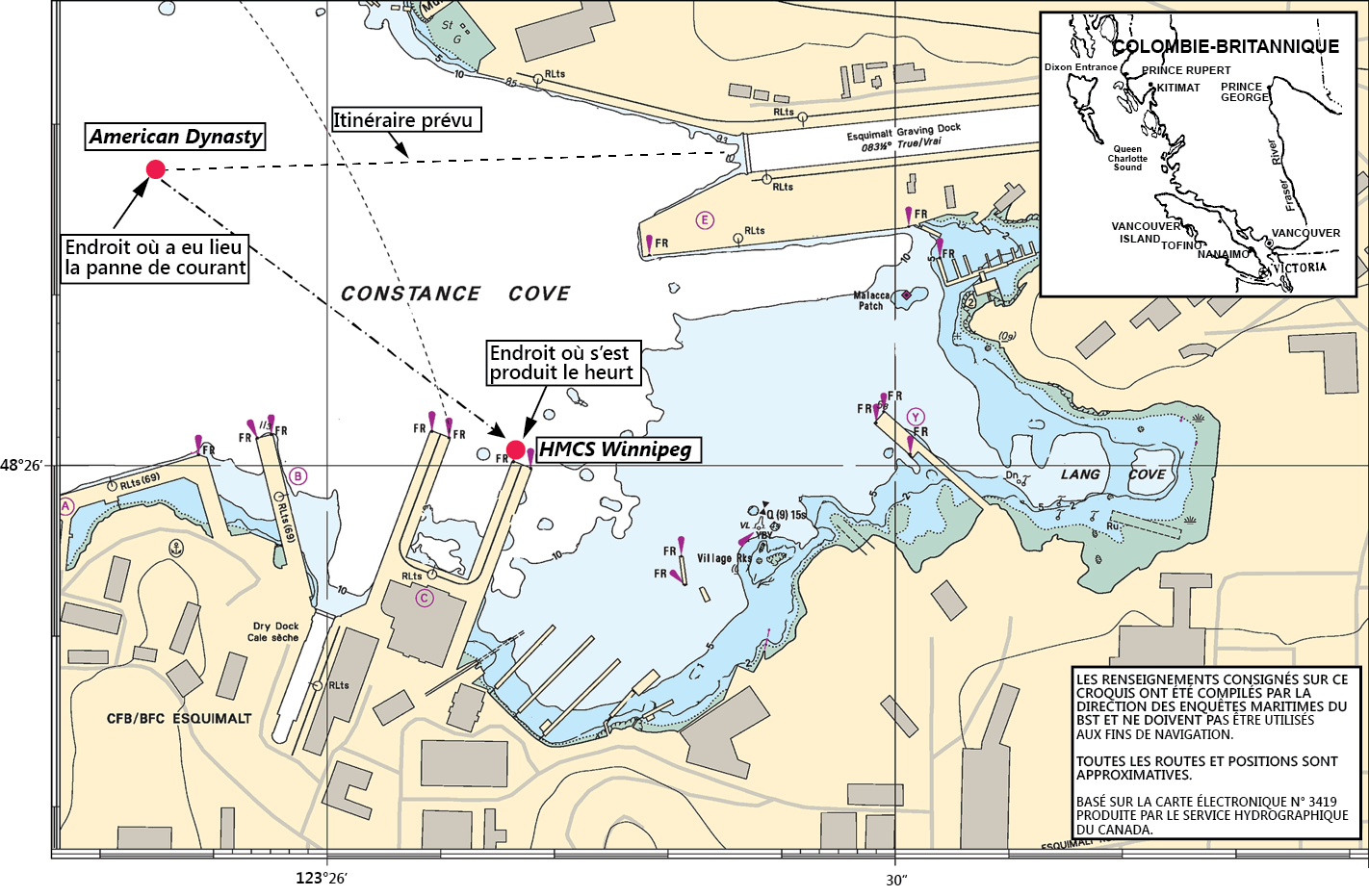 Peu après, le pilote de la côte de la ColombieBritannique a remarqué que le navire virait à tribord et prenait de la vitesse; il a alors averti le capitaine. La trajectoire du navire le menait vers le NCSM Winnipeg, qui était amarré au quai 3C, à la Base des Forces canadiennes (BFC) Esquimalt (annexe B).Dès qu’il a aperçu le sillage de l’hélice, le capitaine a tenté d’appeler la salle des machines à l’aide du téléphone principal, mais il n’y avait pas de tonalité. Il a alors demandé au capitaine en second d’aller à la salle des machines et d’évaluer la situation. L’American Dynasty était alors à environ 400 m du NCSM Winnipeg.