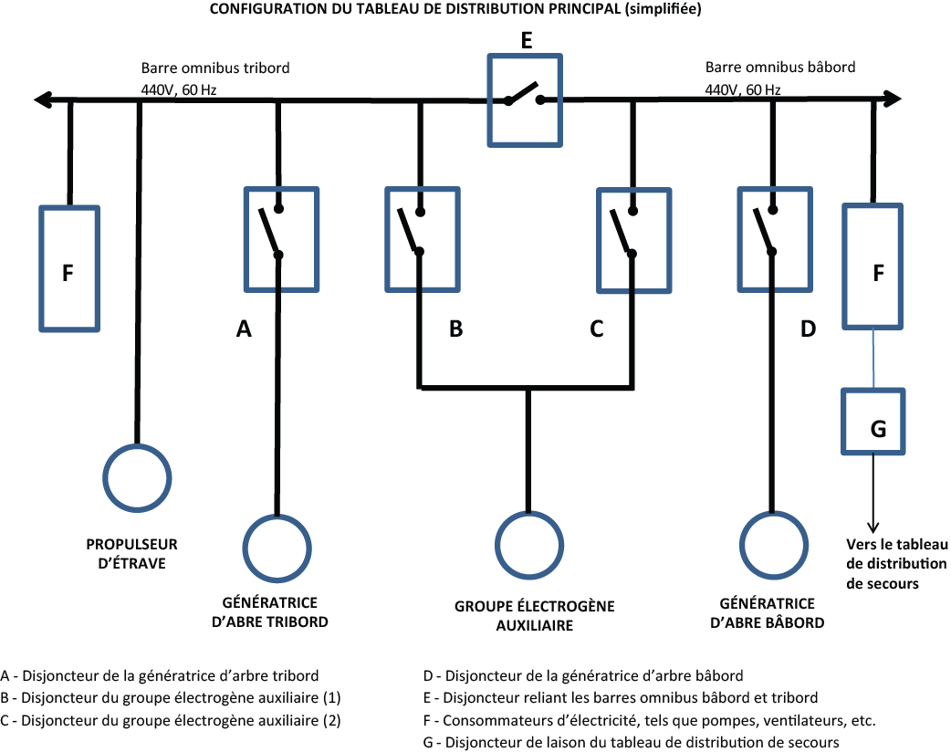 Le graisseur et le chef mécanicien sont retournés immédiatement à la salle de commande des moteurs, où le chef mécanicien a remarqué qu’il y avait eu déclenchement du disjoncteur sur le tableau de distribution principal. Ce déclenchement signifiait qu’il n’y avait aucune alimentation électrique, même si le moteur du groupe électrogène auxiliaire était toujours en marche. Le chef mécanicien a essayé de refermer le circuit du groupe électrogène auxiliaire sur le tableau de distribution principal au moyen des boutonspoussoirs qui se trouvent sur les disjoncteurs, mais ceuxci ne se sont pas réenclenchés. Le chef mécanicien a aussi remarqué que le panneau de commande de la propulsion était hors tensionNote de bas de page 19.