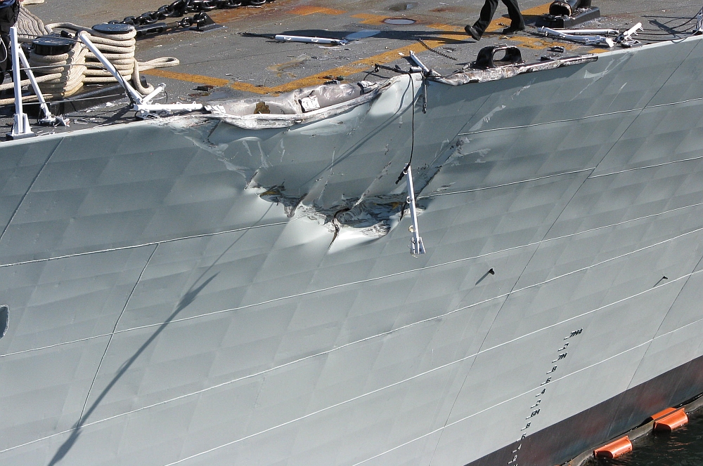 Il y a également eu gauchissement local des ponts et des cloisons à proximité de l'impact. Il y a eu des perforations et des enfoncements dans le bordé extérieur tribord, et certains des supports latéraux et des porques connexes ont été endommagés. Le coin tribord de la poupe a été déformé, tout comme l'ont été les supports latéraux et les goussets antiflambage connexes.
