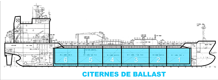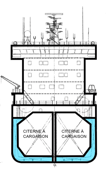 Remarque : les citernes latérales (citernes de ballast) sont ombrées (en bleu). Les citernes nos 1, 3 et 5 sont divisées par une cloison posée sur l'axe longitudinal du navire et les citernes nos 2, 4 et 6 sont continues.