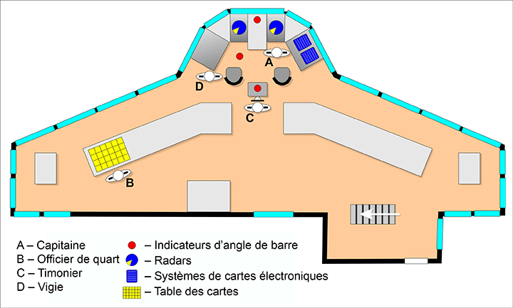 Le navire est gouverné à partir d'un poste de barre central qui se trouve légèrement à l'arrière de la console centrale. Il y a 3 indicateurs d'angle de barre : 1 au poste de barre, 1 à la console centrale entre les radars et 1 monté au plafond au-dessus et légèrement à l'arrière du radar bâbord (annexe B). Le voyant de l'indicateur monté au plafond était hors service au moment de l'événement.
