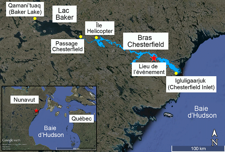 Le bras Chesterfield est une voie navigable de 124 milles marins (nm) reliant le lac (d'eau douce) Baker, à la baie d'Hudson (annexe C). L'agglomération de Baker Lake se trouve à 40 nm de l'embouchure du bras Chesterfield. Dans ce bras, de puissants courants de marée de 3 à 5 nœuds créent des courants traversiers dans une grande partie de la voie navigable. Dans le passage Chesterfield, des courants de jusant atteignant jusqu'à 8 nœuds ont été signalés, et des clapotis de maréeNote de bas de page 1 se forment fréquemment dans le chenal de l'île Deer. La profondeur minimale le long du bras est de 4,2 m dans le passage ChesterfieldNote de bas de page 2.