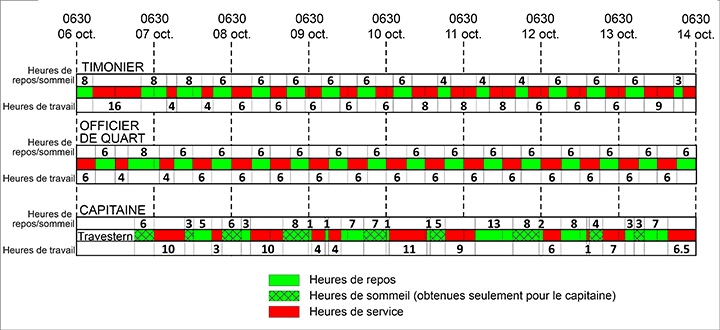 Horaires de travail et de repos du capitaine, du timonier et de l'officier de quart pour la période précédant l'événement. Noter que dans les heures de repos du capitaine, les heures de sommeil proprement dites sont indiquées (zones hachurées). Les heures du capitaine comprennent celles du 6 octobre alors qu'il était à bord du Travestern. Le jour suivant, le capitaine est monté à bord du Nanny.