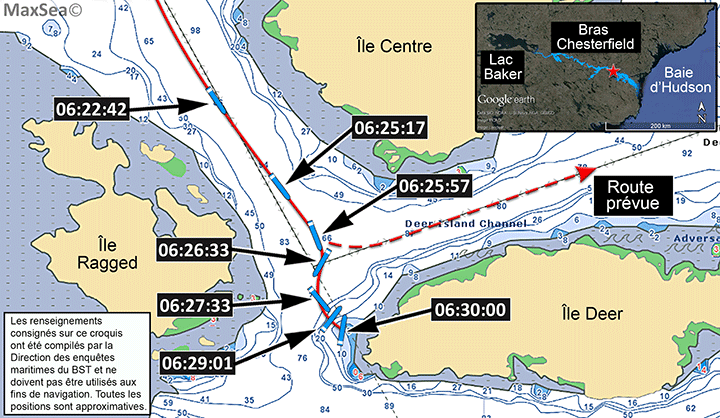 Le 14 octobre à 1 h 50, le Nanny a été désamarré du Travestern et s'est mis en route vers l'agglomération de Chesterfield Inlet en bordure de la baie d'Hudson, à environ 107 nm. L'équipe à la passerelle était alors composée du capitaine, d'un second officier, d'une vigie et d'un timonier. À 5 h 45, le timonier et la vigie ont été relevés par un nouveau quart. À 6 h, le second officier a porté une position sur la carte en utilisant une distance et un relèvement radar, puis il a été relevé par le 3e officierNote de bas de page 4 en tant qu'officier de quart.