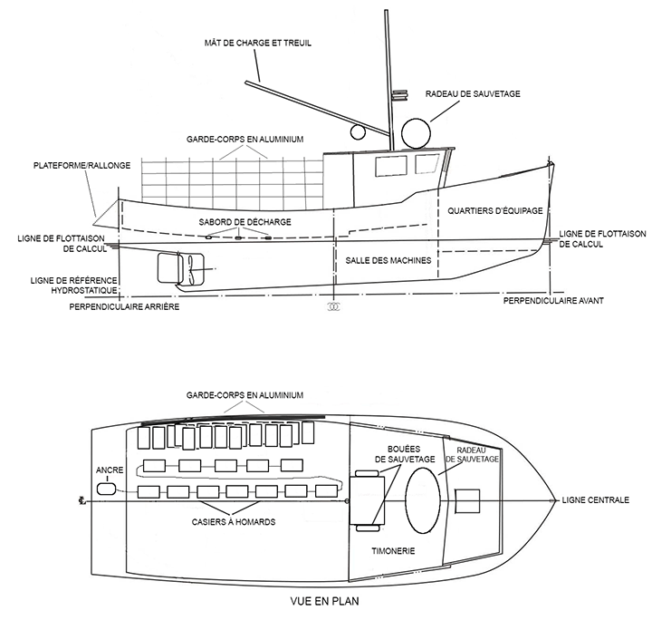 Le Four Ladies 2003 est un petit bateau de pêche à construction ouverte du type Cape Island, fait de plastique moulé renforcé de fibre de verre. La timonerie et les quartiers de l'équipage sont situés à l'avant du milieu du navire, et la salle des machines se trouve sous la timonerie (photo 1). Il est possible d'accéder à la timonerie par des portes situées à l'arrière et du côté tribord de celle-ci. On accède à la salle des machines par une écoutille fermée, située dans la timonerie.