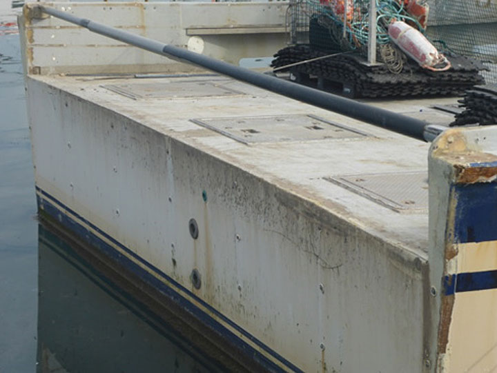 Bien que la majorité des pêcheurs qui travaillent sur ces bateaux laissent la plateforme de poupe ouverte pendant la pêche au homard, certains ferment l'ouverture par une chaîne ou une barre d'aluminium pour fournir une protection (photo 4). Les barres peuvent être réglables et être placées de diverses manières sur le pont afin d'éviter que les membres d'équipage ne s'approchent trop près de la poupe ouverte. De plus, la barre peut être placée entre les membres d'équipage et la poupe ouverte pour former une barrière physique lorsqu'ils préparent les casiers pour le mouillage.