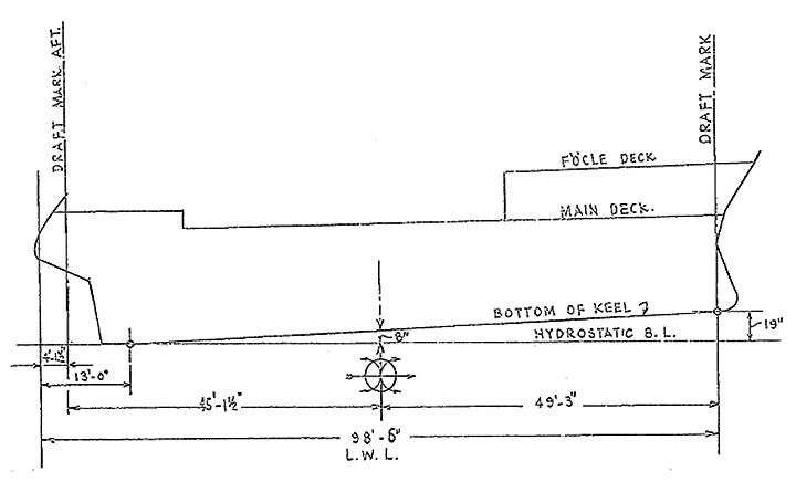 | Navire lège (1976) + poids présumés du carburant/de l'eau douce selon le livret de stabilité + poids estimés du poisson/de l'eau de mer (2015) (Reflète le changement de poids lié aux méthodes de chargement du poisson/de l'eau de mer.) |