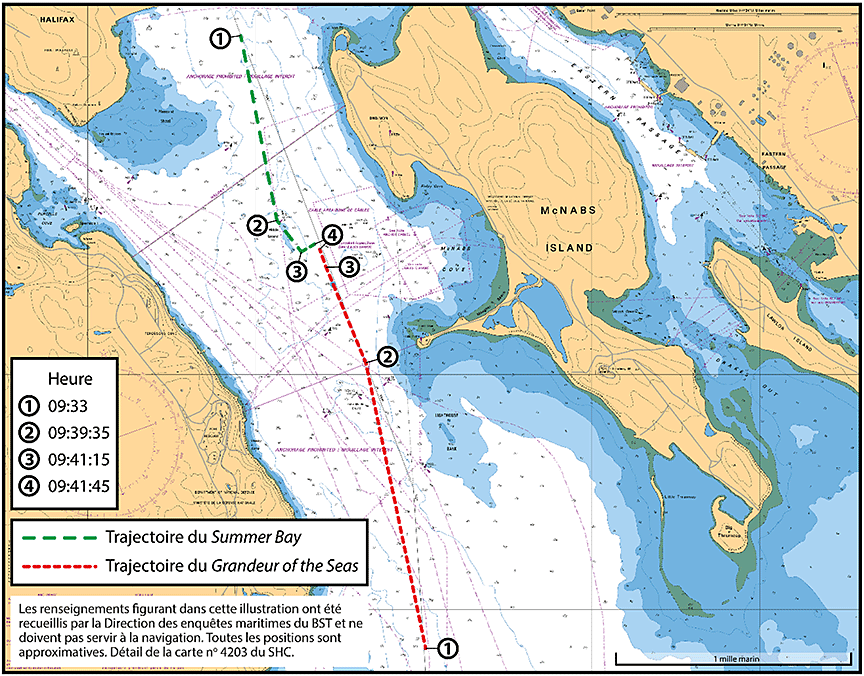 Le Summer Bay sortait du port au même moment où le navire de croisière Grandeur of the Seas se trouvait à l'entrée de port, en route vers le quai 20 du terminal de navires de croisière de Halifax. Il y avait environ 2000 passagers et 770 membres d'équipage à bord du Grandeur of the Seas. L'équipe à la passerelle était composée du capitaine, du commandant adjoint, du capitaine en second et d'un pilote.