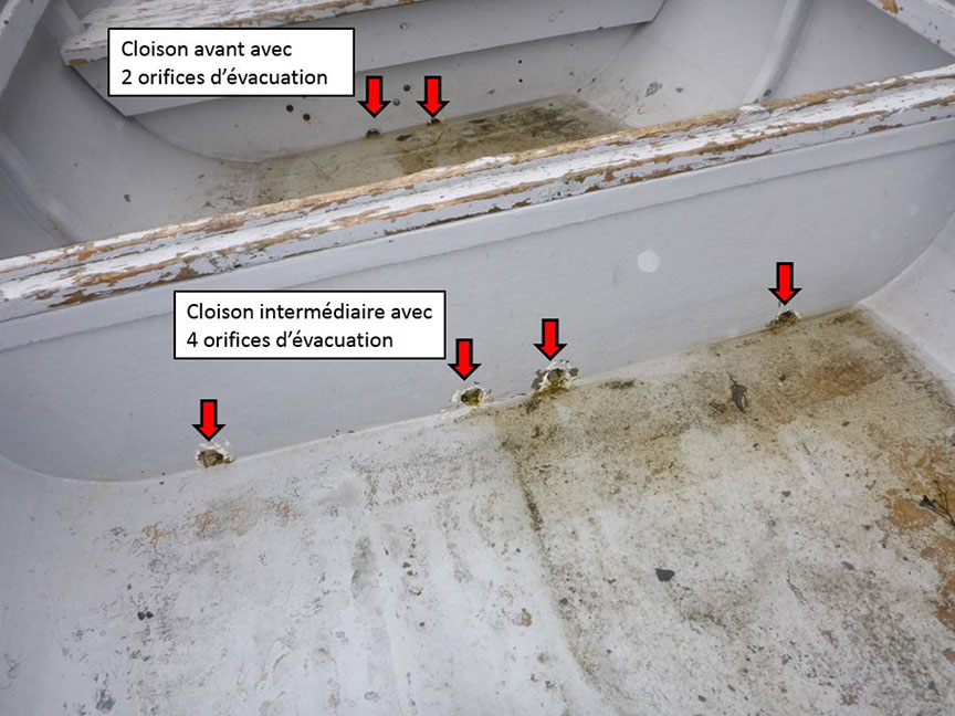 Pour laisser l'eau s'écouler vers le tableau arrière, les cloisons sont percées au niveau du pont, soit de 2 trous en demi-lune (9 cm de diamètre) dans le cas des cloisons avant et arrière, et de 4 trous ronds (5 cm de diamètre) dans le cas des 2 cloisons intermédiaires. Quant au tableau, il est percé de 1 orifice d'évacuation (2,5 cm de diamètre) et muni d'un bouchon amovible (annexe A).
