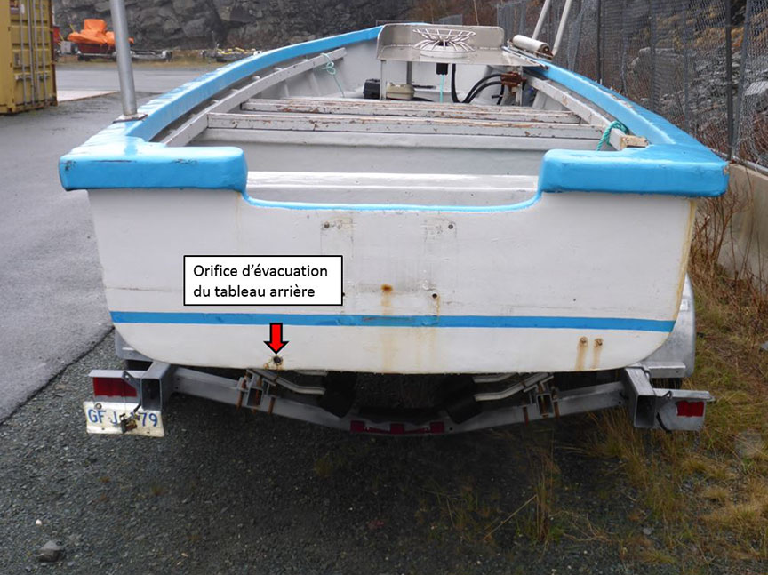 L'inspection du bateau après sa récupération a permis de déterminer que sa coque n'était pas endommagée. Le bouchon était bien enfoncé dans l'orifice d'évacuation du tableau arrière. Le compartiment de rangement avant était dépourvu de contenu et de couvercle. Le réservoir d'essence métallique du moteur qui entraînait le haleur de filets hydraulique était déformé, vraisemblablement par la pression d'eau lorsque le bateau reposait sous 75 m d'eau. Une grande partie de l'éperon du moteur hors-bord manquait par suite d'un accident antérieur sans rapport avec l'événement à l'étude. Le dessus du capot moteur était fracturé; toutefois, on n'a pu déterminer si ce dommage était antérieur à l'événement ou s'il a été causé par le choc du bateau avec le fond marin lorsqu'elle a coulé. Le moteur se trouvait en position relevée de rangement, et la batterie de 12 volts n'était reliée que par 1 fil.