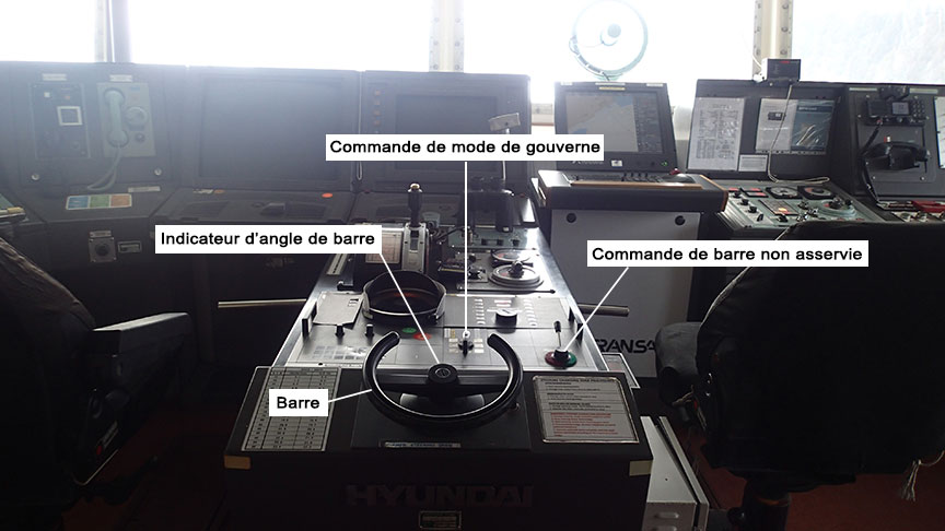 À bord du MSC Monica, la barre du poste de conduite du pupitre principal de la passerelle est utilisée pour gouverner lorsque le navire est en mode asservi. Devant la barre, un indicateur d'angle de barre (figure 2) affiche l'angle commandé de l'appareil à gouverner. Un indicateur d'angle de gouvernail à 3 faces installé au plafond, sur l'axe longitudinal de la passerelle de navigation, indique la position réelle du gouvernail (figure 3).