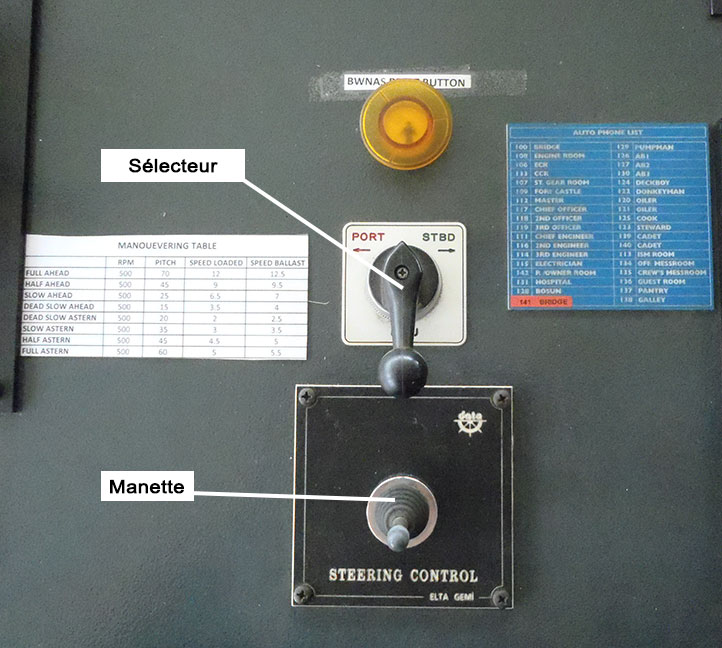 Avant le départ de Québec, l'équipage a modifié la présentation de la commande de barre non asservie : on a enlevé le disque de plastique translucide fixé à sa base et apposé de chaque côté de la commande deux étiquettes de couleur : une rouge avec le mot PORT (bâbord) et une verte avec l'abréviation STBD (starboard [tribord]) (figure 9).