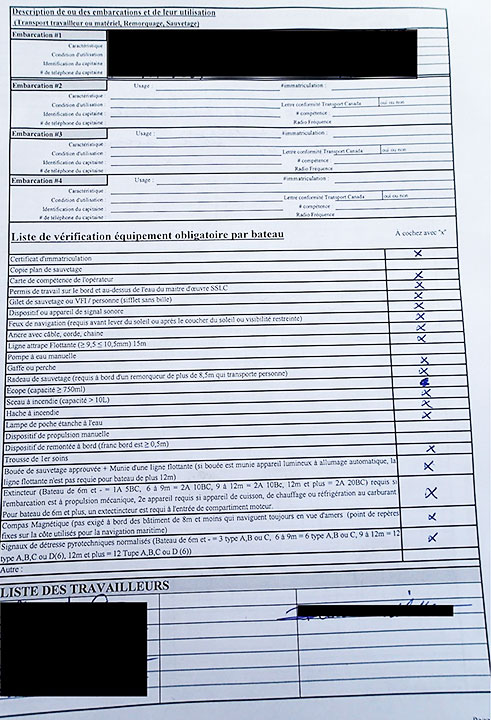 Au moment de l'événement, chacun des navires utilisait une « liste de vérification équipement obligatoire par bateau ». Les membres des équipages vérifiaient leur navire et le matériel connexe au début de chaque journée de travail et remplissaient la liste de vérification (annexe B). La liste de vérification s'appliquait à tous les navires et portait généralement sur la présence ou l'absence de certaines pièces du matériel d'exploitation à bord, mais non sur l'état du matériel. De plus, certains éléments devant être vérifiés ne figuraient pas sur la liste et, par conséquent, n'étaient pas toujours inspectés. Par exemple, l'intégrité de l'étanchéité à l'eau n'était pas sur cette liste.