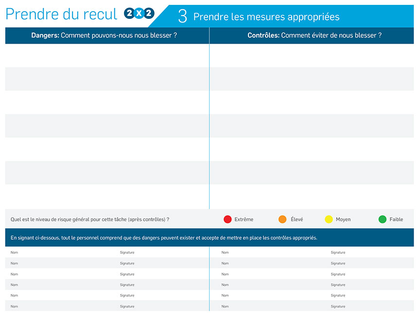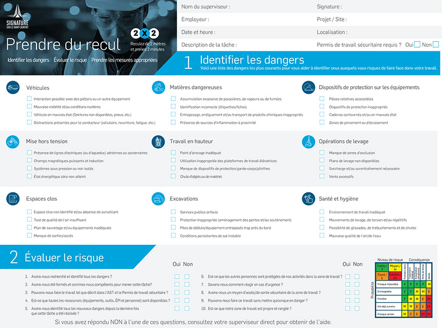 Au moment de l'événement, SSLC exigeait que ses employés utilisent une liste de vérification pour l'évaluation des dangers et des risques. Les travailleurs procédaient chaque jour à une évaluation des risques dans les travaux de construction prévus ce jour-là (annexe C). Cette liste de vérification « Prendre du recul » indiquait tous les éléments sur le chantier, y compris les véhicules utilisés et l'équipement de protection individuelle pouvant être nécessaire. Le processus exigeait notamment que les employés « reculent de 2 mètres et attendent 2 minutes » avant d'entreprendre une nouvelle tâche. La liste de vérification « Prendre du recul » pour l'évaluation de tâches de SSLC visait 3 buts : cerner les risques; évaluer les risques; et prendre des mesures efficaces. La liste de vérification comportait une section finale où les employés devaient déterminer le risque général pour l'exploitation (annexe C). Ces listes de vérification étaient conçues pour les chantiers terrestres et ne tenaient pas compte des opérations maritimes. SSLC avait aussi sur les lieux, à terre, un agent de santé et de sécurité du travail. Tous les employés devaient participer à une séance d'information sur la sécurité sur le chantier avant d'y être admis.