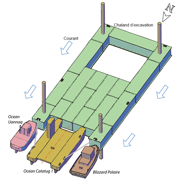 Pour sortir le chaland de la zone d'excavation, tous les pieux d'ancrage étaient relevés afin que le chaland puisse flotter librement et être déplacé. Les différents capitaines de l'Ocean Catatug 1 ont déclaré que pour déplacer le chaland, ils faisaient normalement lever les pieux d'ancrage en aval d'abord, puis les pieux d'ancrage en amont. Durant cette manœuvre, les remorqueurs sont positionnés de chaque côté du chaland et arrimés à celui-ci (figure 11).