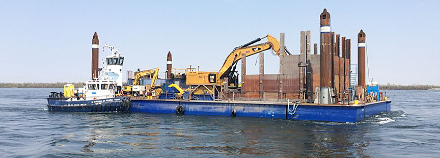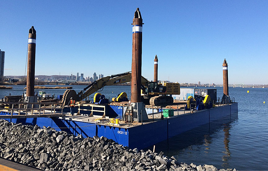 Le chaland est doté de 4 pieux d'ancrage qui permettent de l'ancrer à la position voulue au cours des travaux de construction (figure 6). Quatre treuils hydrauliques commandés par une petite excavatrice installée à bord permettaient de faire monter et descendre ces pieux d'ancrage, un à la fois ou par paires, en moins de 1 minute (les 2 pieux d'ancrage avant, les 2 pieux d'ancrage arrière ou 1 pieu d'ancrage avant et 1 pieu d'ancrage arrière diagonalement opposés, mais pas les 2 pieux d'ancrage du même côté). Les pieux d'ancrage peuvent servir à soulever le chaland et à en supporter entièrement (ou partiellement) le poids. Lorsque les 4 pieux d'ancrage sont enfoncés, des panneaux verticaux en acier (appelés déflecteurs) peuvent être abaissés sous le chaland pour dévier le courant de la zone d'excavation. Cela crée une zone de travail protégée pour les travaux de précision. Les déflecteurs sont relevés lorsque le chaland doit être déplacé.