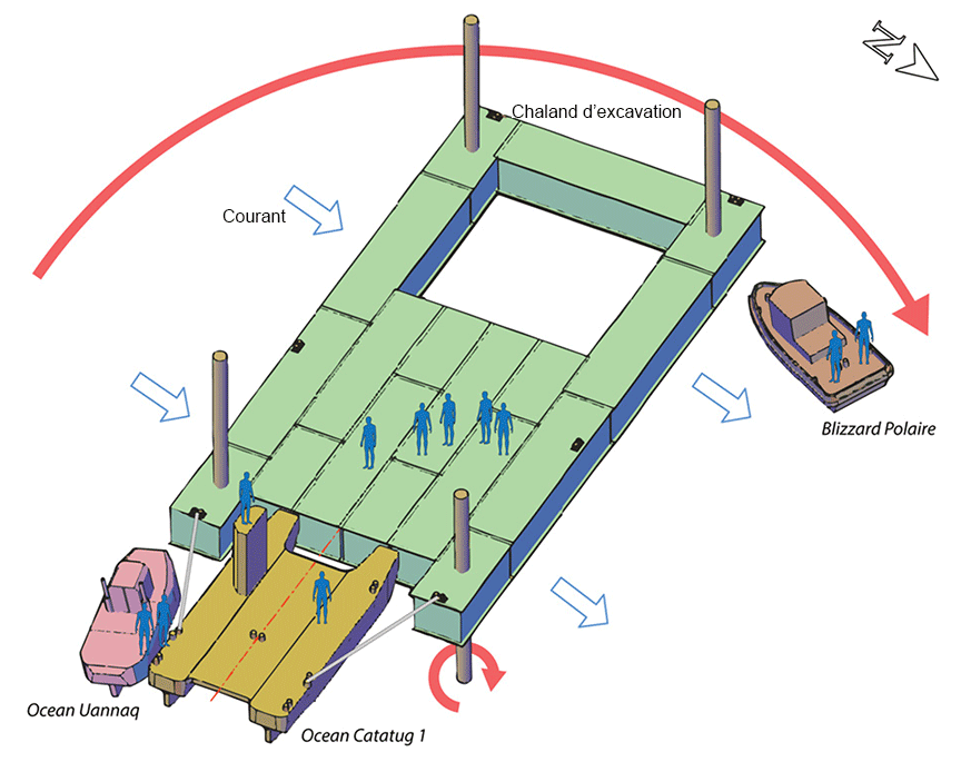 Toute la journée du 1er avril 2016, les remorqueurs Ocean Uannaq, Blizzard Polaire et Ocean Catatug 1 ont déplacé latéralementNote de bas de page 4 le chaland d'excavation vers de nouvelles zones du fond du fleuve pour des travaux d'excavation. Les 3 remorqueurs ont aussi déplacé d'autres chalands en suivant les directives du chef de chantier de construction maritime à terre, y compris un chaland à treuil de plus petite taille, avec tous les pieux d'ancrage relevés, à un site rapproché. Ce soir-là, le chaland d'excavation devait être déplacé au quai de travail de l'île des Sœurs pour des travaux de soudage.