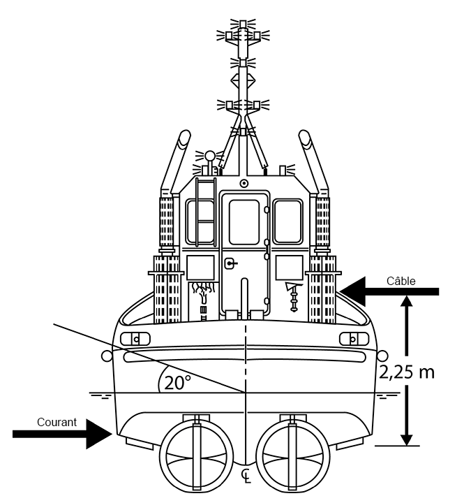 Après l'événement, un architecte naval indépendant et le BST ont évalué la stabilité de l'Ocean Uannaq. Ils ont établi que le remorqueur était stable et que le bras de levier de redressement pouvait redresser le remorqueur à la verticale depuis un angle de gîte de 20º ou moins. La force du courant sur le côté bâbord de la coque de l'Ocean Uannaq et celle exercée par le câble du chaland (qui était haut sur le côté tribord) s'opposaient, ce qui a créé un moment de chavirement (figure 12). De plus, l'eau qui a envahi le pont a encore réduit la capacité de redressement de l'Ocean UannaqNote de bas de page 12.