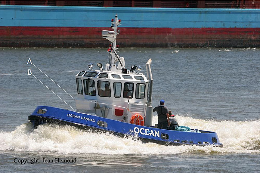 La timonerie, qui comprend le matériel de navigation et les commandes du navire, est située au sommet d'une tour à bâbord sur le remorqueur. On y accède par un escalier extérieur situé à l'arrière de la tour. Une grue hydraulique est située à tribord, face à la tour. Des treuils hydrauliques sont installés de chaque côté du pont principal arrière. Ces treuils sont équipés d'un câble métallique qui peut servir à arrimer le remorqueur à un chaland (figure 5).