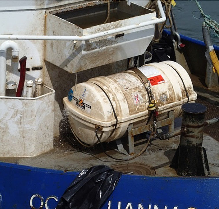 L'Ocean Uannaq transportait 1 radeau de sauvetage pour 6 personnes. Ce radeau était arrimé à un berceau soudé, sous une armoire de rangement sur le pont principal, juste devant la timonerie (figure 13). Le largueur hydrostatique Hammar H-20 de l'Ocean Uannaq était doté d'un mécanisme de largage automatique déclenché par la pression de l'eau. Lorsque le dispositif est immergé dans 1,5 à 4 m d'eau, la pression fait surgir du boîtier du largueur une lame tranchante montée sur ressort. Cette lame coupe la ligne d'amarre reliée à la courroie qui retient le radeau de sauvetage dans son berceau. Le conteneur du radeau de sauvetage rejoint la surface de l'eau grâce à sa flottabilité. Le largueur hydrostatique à bord de l'Ocean Uannaq ne demandait aucune pièce de rechange, aucune maintenance et aucun entretien annuel. Il devait toutefois être remplacé tous les 2 ans. Le dispositif en place au moment de l'événement devait être remplacé en avril 2016.