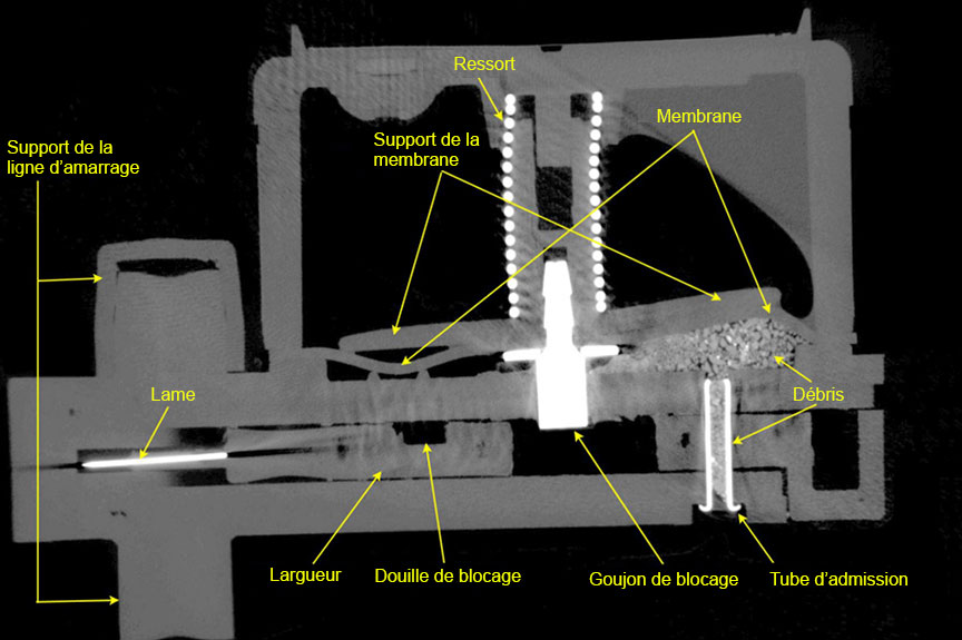 À la suite de l'événement, le largueur hydrostatique a été examiné au Laboratoire d'ingénierie du BST. L'ensemble membrane/support et goujon de blocage qui, lorsqu'il n'est pas déclenché, retient le ressort de la lame comprimé, avait été soulevé à la hauteur d'une accumulation de débris sous la membrane. On a établi que ces débris n'auraient pu s'accumuler que si l'ensemble membrane/support et goujon de blocage avait été soulevé par la pression de l'eau. Cette hauteur correspond à la position maximale de l'ensemble membrane/support. Le déplacement dans cette position fait que le goujon de blocage sort de la douille de blocage et déclenche le largueur. Même s'il a été impossible de déterminer la profondeur exacte de son déclenchement, on a établi que le dispositif a fonctionné comme prévu une fois immergé (figure 15).