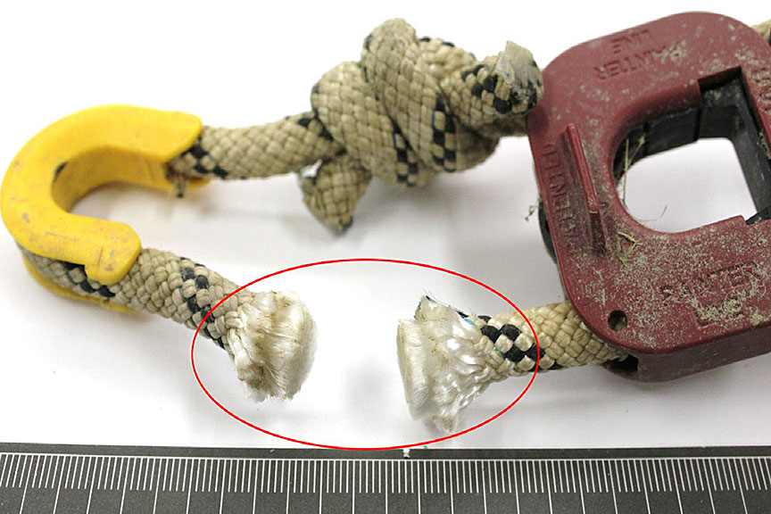 Il a été observé que la lame était sortie, et la ligne était coupée du dispositif. Les extrémités coupées de la ligne présentaient les caractéristiques d'une coupe nette ayant tranché tous les brins de la ligne (figure 16). Le largueur hydrostatique avait fonctionné comme prévu, mais on n'a pas pu établir pourquoi le radeau de sauvetage n'avait pas été éjecté de son berceau.