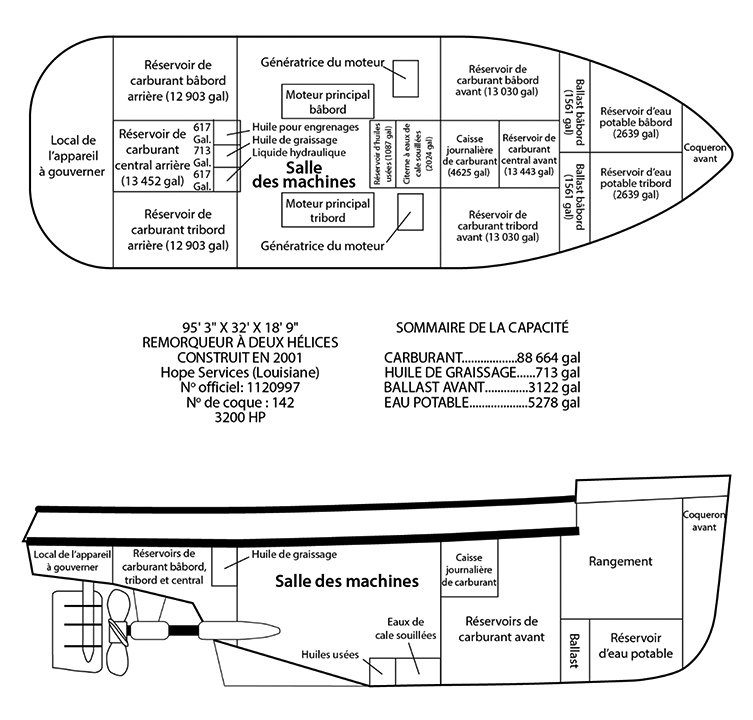 Sous le pont principal se trouvaient le coqueron avant, un compartiment de rangement, la salle des machines et le local de l'appareil à gouverner. Les vérins de couplage pneumatiques bâbord et tribord, qui servaient à fixer des chalands au remorqueur, se trouvaient dans le compartiment de rangement. Ce remorqueur était aussi doté de 7 réservoirs de carburant (3 à l'arrière et 4 à l'avant) et de réservoirs pour l'huile de graissage, l'huile pour engrenages, le liquide hydraulique, l'huile usée et l'eau de cale (annexe A)Note de bas de page 3 .