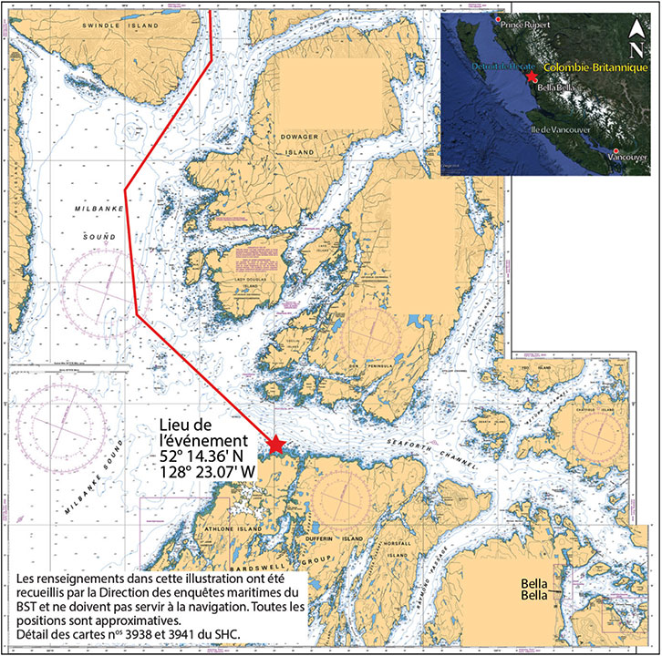 Vers 1 h 6Note de bas de page 8 , le RCA a heurté le récif Edge, qui se trouve au large de l'île Athlone, à l'entrée du passage Seaforth et à environ 10 nm à l'ouest de Bella Bella (Colombie-Britannique), par 52°14,37′ N, 128°23,08′ W (annexe B). Après l'impact, le second officier a mis les 2 moteurs en marche arrière et la barre à bâbord toute. Le préposé adjoint au débardage, qui n'avait pas encore atteint la timonerie, a ressenti l'impact et a appelé le second officier par radio. Le second officier a avisé le préposé adjoint au débardage que le RCA avait heurté le récif.