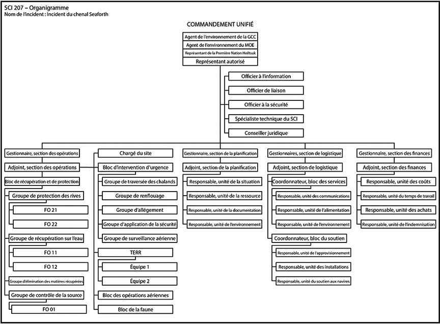 - des organismes de surveillance et d'assistance, dont le programme d'intervention environnementale de la GCC, Environnement et Changement climatique Canada (ECCC), différents services et programmes de TC, Pêches et Océans Canada (MPO), le Ministry of Environment and Climate Change Strategy de la Colombie-Britannique et la Première Nation Heiltsuk