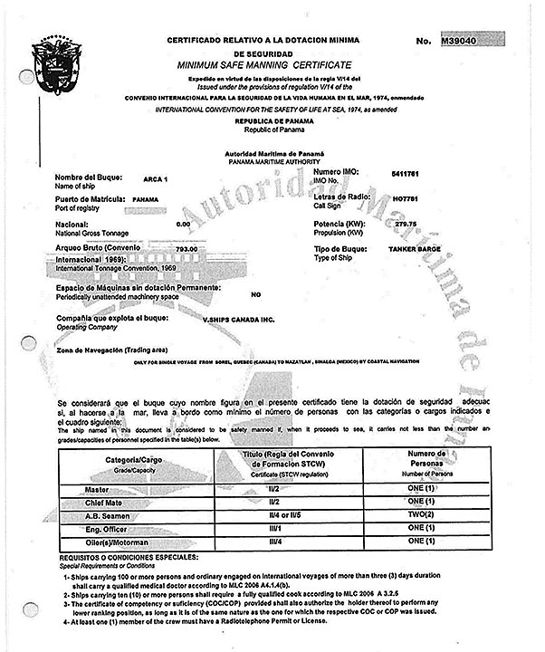 Les autorités maritimes du Panama ont délivré à l'équipage de l'Arca 1 un certificat d'effectif minimal de sécurité pour effectuer un [traduction] « seul voyage de Sorel (Québec, Canada) à Mazatlán (Sinaloa, Mexique) par navigation côtière. » D'après le certificat, le navire devait transporter du personnel possédant des certificats conformes aux exigences STCW mentionnées au tableau 2.