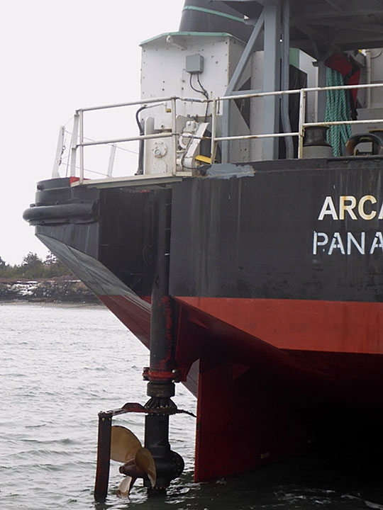 Le navire Arca 1 est un navire-citerne d'une capacité de 1527 m3, développant une vitesse maximale de 8 nœuds. Il sert à transporter du pétrole vers d'autres navires (figure 1). Construit en 1963 à St. Catharines (Ontario), il a été exploité dans les ports de Montréal et de Sorel (Québec). Il était uniquement utilisé pour les voyages en eaux secondaires, classe IINote de bas de page 1 . En 2004, une deuxième coque a été installée au-dessus des réservoirs de stockage de pétrole intérieurs, formant ainsi une double coque (annexe A). Cette installation avait créé un espace de 750 mm entre la coque intérieure et la coque extérieure, lequel comprenait 3 citernes de ballast. Deux moteurs diesel 12V92 alimentant 2 transmissions en Z par l'entremise d'un embrayage de prise de force sont montés sur la poupe et propulsent le navire vers l'avant. Chaque transmission en Z (figure 2) peut effectuer un tour complet (rotation de 360°) et comprend une hélice à pas fixe. On gouverne le navire en modifiant l'orientation des unités de propulsion.