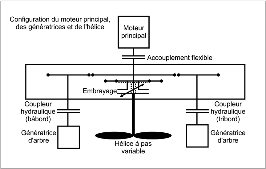 Le moteur principal entraîne un réducteur par l'intermédiaire d'un accouplement flexible (annexe A). Le réducteur est doté de 3 arbres de sortie : l'arbre de sortie inférieur entraîne l'arbre de l'hélice à un rapport de réduction 5,52:1 et les 2 arbres de sortie supérieurs entraînent la génératrice à un rapport de multiplication de 1:2 par l'intermédiaire d'un coupleur hydraulique. Le régime maximal du coupleur hydraulique est de 1800 tr/min. Lorsque le moteur développe son régime de fonctionnement normal de 900 tr/min, l'arbre de l'hélice tourne à 163 tr/min et la génératrice tourne à 1800 tr/min.