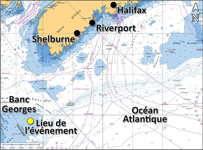 Le 13 mars 2017 à 22 h 15 (heure avancée de l'AtlantiqueNote de bas de page 1), après avoir fait relâche une journée au port aux fins d'entretien du moteur, de déchargement des prises, de réapprovisionnement, de ravitaillement en carburant et de relève complète de l'équipage, l'Atlantic Destiny a quitté Riverport (Nouvelle-Écosse) pour effectuer un voyage de pêche aux pétoncles de 21 jours avec 31 personnes à son bord. Le navire a atteint le secteur de pêche près du banc Georges (Nouvelle-Écosse; annexe B) le 14 mars à 14 h 50, et a commencé ses activités de pêche.