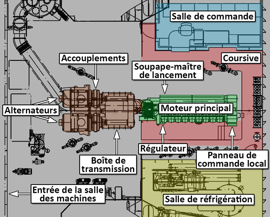 Trois boutons permettent l'arrêt d'urgence du moteur principal : 2 sur la passerelle et 1 dans la salle de commande des machines.