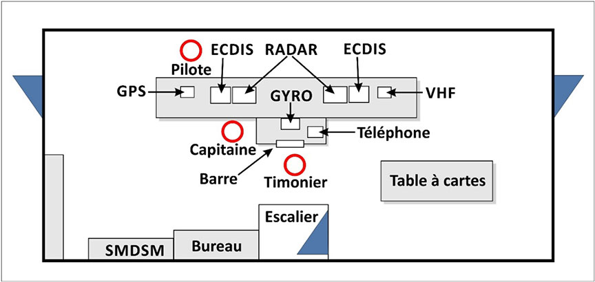 Le pilote, qui se tenait devant la console centrale en faisant face aux fenêtres de la timonerie (figure 3), a ordonné plusieurs manœuvres différentes pour le navire et les remorqueurs afin de ralentir le navire et de changer son cap vers la jetée. Le pilote ne surveillait ni les radars ni l'ECDIS. Il a donné des commandements à la barre sans communiquer ses plans de rechange d'approche de la jetée aux autres membres de l'équipe à la passerelle.