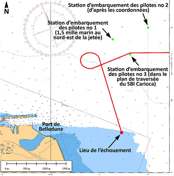 Étant donné qu'aucune carte n'indiquait l'emplacement de la station d'embarquement des pilotes, le capitaine a ordonné que le SBI Carioca se dirige vers une zone à environ 1,5 nm au nord-est de la jetée.
