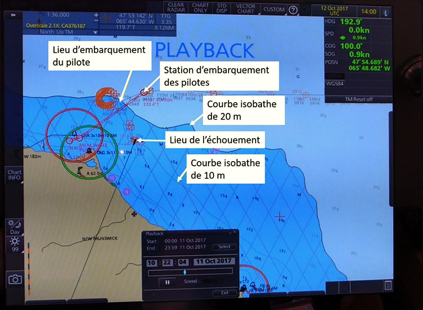Le capitaine était le seul membre de l'équipe à surveiller l'ECDIS et les radars, pendant que le pilote surveillait la marche du navire uniquement au moyen de repères visuels. Le capitaine n'a communiqué au pilote aucune information qu'il recevait de l'ECDIS et des radars, et le pilote ne lui en a demandé aucune. Toutefois, pendant que le navire se dirigeait vers la courbe isobathe de 10 m sur laquelle il s'est échoué, le pilote ignorait que le navire s'approchait de la rive, et il n'a pas suffisamment ralenti la vitesse du navire.