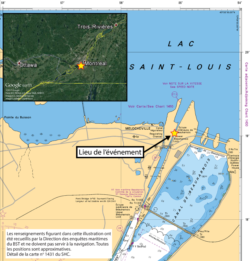 Vers 8 hNote de bas de page 1 le 17 mai, le navire sortait de l'écluse inférieure de Beauharnois dans la Voie maritime du Saint-Laurent sous la conduite d'un piloteNote de bas de page 2 (figure 2). Cette écluse est l'une des 13 que comprend la section canadienne des installations de la Voie maritime du Saint-Laurent, qui sont administrées par la Corporation de Gestion de la Voie Maritime du Saint-Laurent (CGVMSL)Note de bas de page 3. L'éclusier se trouve dans un poste de contrôle à distance situé à Saint-Lambert (Québec).